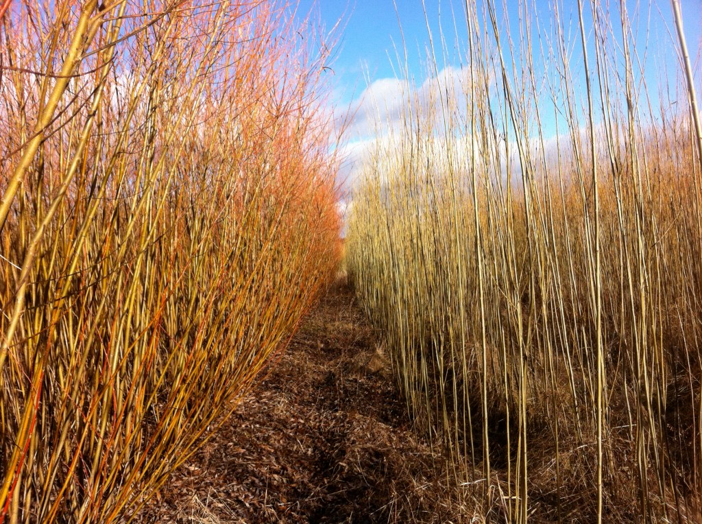 The Middlebury Willow Plot featured two species of willow (one had thick stems but fewer of them, the other had thin stems but more of them) that had been previously treated under four different fertilization schemes (no fertilizer, biosolids compost, urea commercial fertilizer, digested dairy manure).
